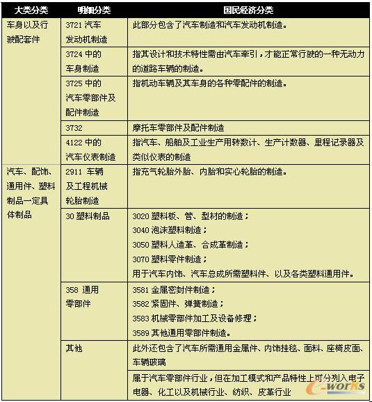 從目前各種媒體、研究資料、國家統計局資料來看,中國的汽車行業的迅猛發展勢頭,依舊是按照每年20%以上的增長速度向前發展,到2010年,整車銷售數量有可能能夠1400萬輛的規模。整個市場非常的樂觀,甚至遇到了2008年整體的經濟調整,甚至減速的大環境下,對于中國汽車消費市場的熱情,各種經濟預測媒體仍然采取了相對樂觀的預測。 但是目前整個行業依然遇到非常大的挑戰,尤其是國內的汽車制造商以及其供應鏈上附著的汽車零部件制造廠商們。其中最大的挑戰,還是大的經濟環境的影響,耳熟能詳的可以列下:鋼材價格的高漲,人工的提高,市場價格的不斷降低,國外市場的開拓艱難,外資企業在技術高端和供應鏈高端的壓迫,整體生存的壓力仍然很大。國內企業對策基本集中在加強專業化生產和設計,努力降低成本,加強和主機廠的經營協同,等等。 從國家統計局的行業統計分類口徑上來看,汽車零部件行業內容可以包括: 表1 汽車零部件行業國民經濟分類