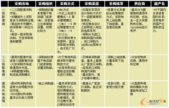 作為整車OEM上游的汽車零部件行業來說,行業分類繁多,產品成千上萬,但都因為和OEM整車生產關聯,因此在采購模式和方式上都具有相似性,并在模式上具有彼此復制拷貝的特性。 作為汽車零部件行業,或者說OEM廠的供應商,國內可以分為一級系統集成商以及二級、三級配件配套商以及通用件配套。在產業布局上:按照整車的BOM金字塔結構分布;企業客戶分布:整車OEM總裝廠售前市場、售后市場、出口市場。 基本的采購特征,多級配套情況下,具有很強彼此影響和復制性。而且采購模型和采購戰略的選擇具備很強的層次性,一般來說,產業鏈層次高的企業,對于下級企業產生很強影響。 2 汽車零部件行業采購特征、發展 汽配零部件行業整體數量發展,每年按照1000家左右的速度遞增,到2008年,已經具有7000多家(國家統計局數據)。在發展過程中,采用的采購方法特點,可以從以下的幾個方面進行說明:采購市場、采購組織、采購方式、采購渠道、采購結算方式、供應商特性、以及采購料品的國產化方面。一言以蔽之,汽車零部件行業對于采購的態度是零庫存,尤其是賬上零庫存 ;配套商都采取統一的策略,向上游壓庫存,延長結算周期。 表3 汽車零部件行業采購管理特征