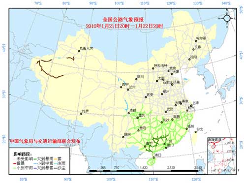 21日20時至22日20時,新疆天山西部、甘肅和西局部、川西高原北部等地有小雪或陣雪,湖北西南部、江南、華南、西南地區東部等地有小到中雨或陣雨,其中,華南中西部及湖南南部、江西南部等地的部分地區有大雨,廣西東部和南部的部分地區有暴雨,貴州中部地勢較高的局部地區有凍雨天氣。另外,南疆盆地部分地區有揚沙或浮塵天氣。