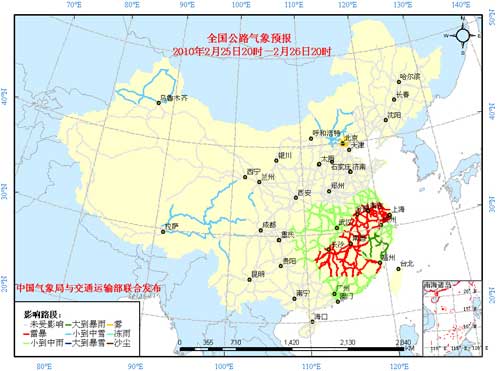 25日20時至26日20時,新疆北部、內蒙古中部的部分地區、華北北部、青藏高原東部、川西高原北部等地有小到中雪(雨)或雨夾雪;黃淮南部、江淮、江漢、江南、華南中東部、重慶東部等地有小到中雨或陣雨,其中,江西東北部、浙江中西部、福建西北部等地的部分地區有大雨,局地暴雨;江南中南部及華南北部有雷暴。另外,今天夜間到明天上午,華北中南部、黃淮大部、江淮大部、西南地區東部、浙江東南部、福建東部、廣東中南部等地將有輕霧或霾,部分地區將有能見度小于1000米,局地能見度小于500米。