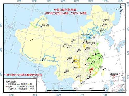 中國氣象局與交通運輸部2月26日聯(lián)合發(fā)布全國主要公路氣象預(yù)報: