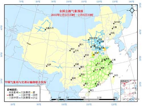 5日20時至6日20時,新疆西北部、西藏東部、黑龍江東北部、內蒙古中部、華北中東部、黃淮大部等地有小到中雪(雨)或雨夾雪;江淮、江南、江漢中南部、華南大部、貴州中東部、重慶東南部等地有小到中雨或陣雨,其中,江西東北部、浙江西部、廣西東北部、湖南南部的局部地區有大雨。南疆盆地、內蒙古西部、甘肅西部等地的部分地區有揚沙或浮塵。