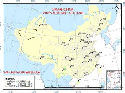 10日20時至11日20時,新疆北部、西藏中東部、青海南部、川西高原南部、云南西北部、內蒙古東北部、黑龍江西北部等地有小到中雪(雨)或雨夾雪,其中新疆西北部的部分地區有大雪;四川盆地南部、貴州西北部、云南東北部和南部、西藏東南部、海南、臺灣南部等地有小雨或陣雨。另外,新疆南疆盆地的部分地區有揚沙或浮塵天氣。