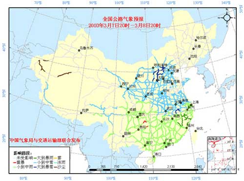 中國氣象局與交通運輸部2010年03月07日聯合發布全國主要公路氣象預報:7日20時至8日20時,西藏東部、西北地區東部和北部、川西高原、內蒙古中部偏南地區、華北、黃淮、江淮、江漢、江南北部和西部等地有小到中雪(雨)或雨夾雪,其中,陜西北部、山西中北部、河北西北部、安徽南部等地的部分地區有大雪;江南南部、華南、西南地區東部、云南西北部等地有小到中雨或陣雨,其中,江西東部和南部、浙江南部、福建大部、廣東北部等地的部分地區有大雨,上述地區局部還伴有短時雷雨大風等強對流天氣;貴州中部偏東的局部地區有凍雨天氣。另外,新疆南疆盆地以及內蒙古西部的部分地區有揚沙或浮塵。