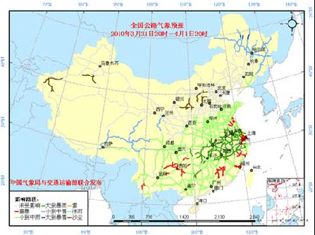 中國氣象局與交通運輸部2010年3月31日聯合發(fā)布全國主要公路氣象預報: