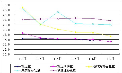 二是物流市場(chǎng)需求進(jìn)一步趨緩。今年以來(lái),物流市場(chǎng)需求整體保持較快增長(zhǎng)。1-7月貨運(yùn)量同比增長(zhǎng)15.3%,貨運(yùn)周轉(zhuǎn)量同比增長(zhǎng)15.1%,港口貨物吞吐量同比增長(zhǎng)17.4%,集裝箱吞吐量同比增長(zhǎng)22%,快遞業(yè)務(wù)總量同比增長(zhǎng)23.6%,均保持較快增長(zhǎng),但增幅分別比上半年回落0.2個(gè)、0.9個(gè)、1.5個(gè)、0.3個(gè)和0.9個(gè)百分點(diǎn)。截至到7月底,鐵路、公路、水路、民航貨運(yùn)周轉(zhuǎn)量累計(jì)同比增幅分別比上半年回落0.8個(gè)、0.1個(gè)和0.7個(gè)和2.4個(gè)百分點(diǎn)。(參見(jiàn)圖2)