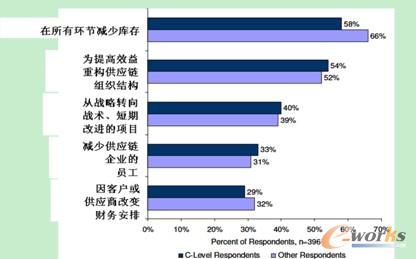 那么,供應(yīng)鏈管理人員采取什么行動來緩解這些壓力,應(yīng)對競爭呢?受訪者認(rèn)為,企業(yè)最應(yīng)做的事就是在所有環(huán)節(jié)上減少庫存。企業(yè)還需要為提高效率需要重構(gòu)供應(yīng)鏈組織,從戰(zhàn)略轉(zhuǎn)向戰(zhàn)術(shù)、短期改進的項目,減少供應(yīng)鏈企業(yè)的員工,還應(yīng)改善因客戶或供應(yīng)商改變而產(chǎn)生的財務(wù)安排。