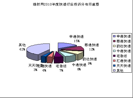 其中申通快遞投訴54條位居第一,圓通快遞投訴45條;韻達快遞投訴33;中通30條;宅急送24條;匯通13條;天天快遞12;其他150條,共361條投訴,其中申通投訴占14.9%,圓通占總數12.4%韻達占總數9.1%。維權網根據2010年收到的投訴進行總結發現,快遞行業存在如下幾點問題亟待解決: