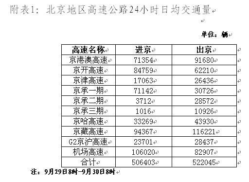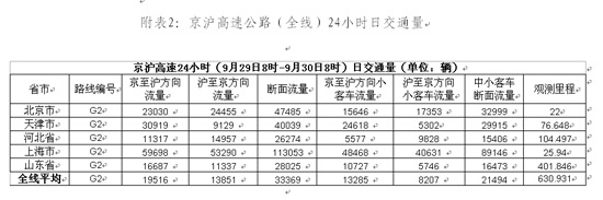 以京滬高速為例,9月29日8時至9月30日8時,京滬高速全線平均斷面流量為33369輛(京滬方向19517輛、滬京方向13852輛),其中中小客車斷面流量 21494輛。京滬高速沿線途徑五省(市)中,以上海市日交通量最大,斷面流量 為112989輛(京滬方向59699輛、滬京方向53290輛)。24小時車流量具體情況 見附表2。