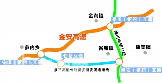 金安高速公路起于南安(金淘)亭川樞紐互通(與泉三高速公路相連接),經(jīng)南安市眉山與安溪縣城關(guān)、官橋鎮(zhèn)、龍門鎮(zhèn)至雙溪口進(jìn)入廈門市境內(nèi),全長57.02公里,全線設(shè)5處互通、1處服務(wù)區(qū),項目于2008年12月開工建設(shè)。