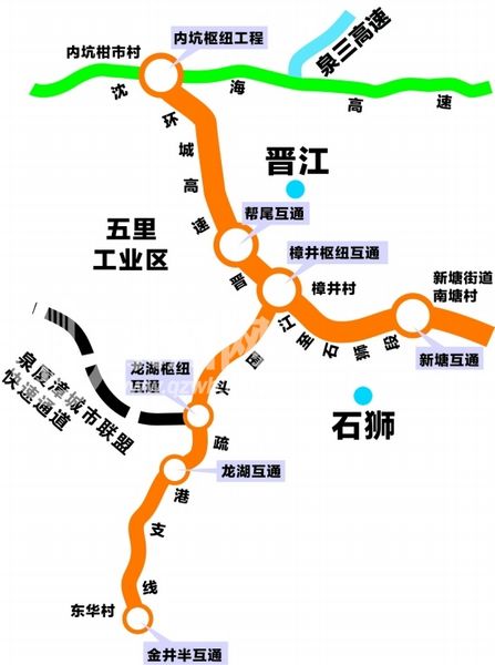 晉石高速公路經(jīng)晉江、石獅這兩個泉州經(jīng)濟(jì)發(fā)展最為活躍的地區(qū),接沈海高速公路,連泉州灣跨海大橋,發(fā)揮環(huán)城高速整體路網(wǎng)效益、促進(jìn)“海灣型”城市建設(shè)。