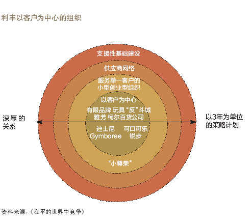 1973年上市以后,利豐逐漸建立起以客戶為中心而不是按地區(qū)劃分的組織營運(yùn)架構(gòu)。目前,利豐擁有超過250~300個分組專注于特定的客戶需求,每個分組的運(yùn)作就像一個獨(dú)立企業(yè),分組經(jīng)理擁有充分的決策權(quán)以滿足顧客快速變化的需求。1998年,馮國經(jīng)在接受美國《哈佛商業(yè)評論》采訪時,對利豐所建立的以客戶為中心的組織營運(yùn)架構(gòu)曾有一個清楚的說明: