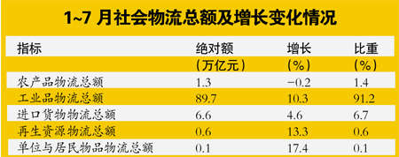 值得注意的是,今年以來多家電商企業(yè)間連續(xù)的價(jià)格戰(zhàn)以及網(wǎng)購和快遞市場的爆發(fā)式增長都持續(xù)推動(dòng)單位與居民物品物流總額快速增長。今年1~7月單位與居民物品物流總額同比增長17.4%,增幅高出社會(huì)物流總額7.6個(gè)百分點(diǎn)。