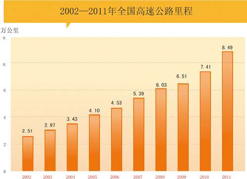 十年間,我國高速公路由2002年底的2.51萬公里增加到2011年底的8.49萬公里,躍居世界第二。截至2011年底,8.6萬公里國家高速公路網(wǎng)已經(jīng)建成6.4萬公里,占75%,在建的約1萬公里,占11%,預(yù)計(jì)到“十二五”末,國家高速公路網(wǎng)將基本建成