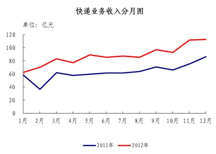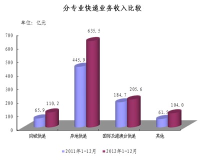 2012年,全國(guó)規(guī)模以上快遞服務(wù)企業(yè)業(yè)務(wù)量完成56.9億件,同比增長(zhǎng)54.8%;業(yè)務(wù)收入完成1055.3億元,同比增長(zhǎng)39.2%。其中,同城業(yè)務(wù)收入完成110.2億元,同比增長(zhǎng)67.3%;異地業(yè)務(wù)收入完成635.5億元,同比增長(zhǎng)42.5%;國(guó)際及港澳臺(tái)業(yè)務(wù)收入完成205.6億元,同比增長(zhǎng)11.3%。