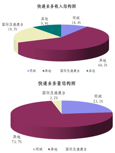 2012年,同城、異地、國(guó)際及港澳臺(tái)快遞業(yè)務(wù)收入分別占全部快遞收入的10.4%、60.2%和19.5%;業(yè)務(wù)量分別占全部快遞業(yè)務(wù)量的23.1%、73.7%和3.2%。與去年同期相比,同城快遞業(yè)務(wù)收入的比重上升1.7個(gè)百分點(diǎn),異地快遞業(yè)務(wù)收入的比重上升了1.4個(gè)百分點(diǎn),國(guó)際及港澳臺(tái)業(yè)務(wù)收入的比重下降了4.9個(gè)百分點(diǎn)。