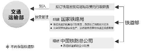 《方案》提出,將鐵道部擬訂鐵路發(fā)展規(guī)劃和政策的行政職責(zé)劃入交通運輸部。交通運輸部統(tǒng)籌規(guī)劃鐵路、公路、水路、民航發(fā)展,加快推進綜合交通運輸體系建設(shè)。組建國家鐵路局,由交通運輸部管理,承擔(dān)鐵道部的其他行政職責(zé),負責(zé)擬訂鐵路技術(shù)標準,監(jiān)督管理鐵路安全生產(chǎn)、運輸服務(wù)質(zhì)量和鐵路工程質(zhì)量等。組建中國鐵路總公司,承擔(dān)鐵道部的企業(yè)職責(zé),負責(zé)鐵路運輸統(tǒng)一調(diào)度指揮,經(jīng)營鐵路客貨運輸業(yè)務(wù),承擔(dān)專運、特運任務(wù),負責(zé)鐵路建設(shè),承擔(dān)鐵路安全生產(chǎn)主體責(zé)任等。不再保留鐵道部。