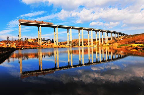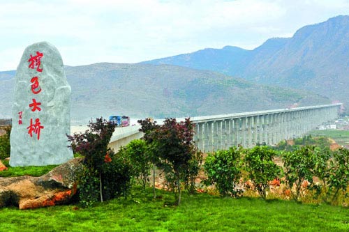 近日,云南大(理)麗(江)高速公路挖色特大橋完工(如圖)。挖色特大橋為T型連續梁橋,全長2651米,最高墩為51米,是目前云南最長的高速公路T型連續梁橋。