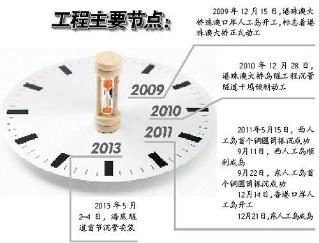 港珠澳大橋是連接香港、珠海和澳門的跨海大橋,于2009年12月15日正式動工,預(yù)計2016年完工。大橋全長近50公里,主體工程長度約35公里,包含離岸人工島及海底隧道,將會形成“三小時生活圈”,縮減穿越三地時間。