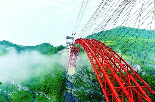 恩黔(湖北恩施至重慶黔江)高速公路龍橋特大橋?yàn)橹骺?68米的上承式鋼管拱橋,其鋼管拱架架設(shè)即將合龍,大橋雄姿初展。該橋是湖北省武陵山少數(shù)民族經(jīng)濟(jì)發(fā)展試驗(yàn)區(qū)內(nèi)恩黔高速公路主要控制性工程之一,建設(shè)工期33個(gè)月,預(yù)計(jì)2014年建成通車。