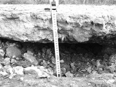 據政新村村委會副主任孔慶明介紹:“這條路寬為4.5米,水泥混凝土路面要求的厚度為20厘米。翻漿處路段中間測量的水泥路面厚度僅為15厘米。這是施工方將路基土層墊高形成圓拱形土底基礎,這樣的話,水泥的用量就會大幅度減少,從而達到偷工減料的目的。因該路段水泥混凝土路面下沒有鋪設砂礫層,所以,水泥路面因底層土層基礎變化而多處斷裂,通車剛3年就成危路了。