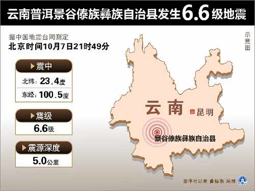10月07日21時49分在云南省普洱市景谷傣族彝族自治縣(北緯23.4度,東經100.5度)發生6.6級地震,震源深度5千米。災害發生后,云南省交通運輸系統各單位、各部門全力投入到了搶救群眾生命、抗擊地震災害的斗爭中。