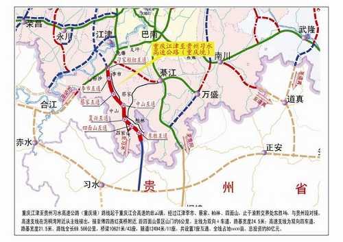 江習(xí)高速公路項目是重慶市“三環(huán)十二射七聯(lián)線”中的第十一條射線,起于江津至四川合江高速公路刁家互通,接入貴州習(xí)水縣寨壩鎮(zhèn)兩路口,重慶段全長約72公里(其中高速公路主線65公里),貴州段長近40公里,經(jīng)江津區(qū)慈云、李市、蔡家、柏林、四面山,與貴州習(xí)水相接。江習(xí)高速總投資約80億元,項目全線橋梁約12.9公里,隧道約3.8公里,共布設(shè)樞紐立交2座,一般互通5座,路基寬度24.5米,其中中央分隔帶寬2米,設(shè)計車速為每小時80公里。