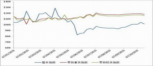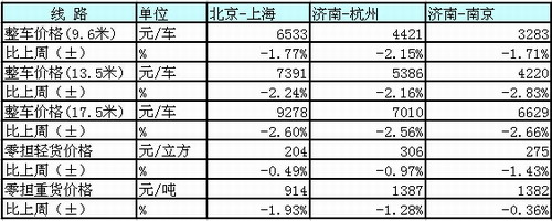 分車型指數環比均有所回落,整車指數環比降幅略高于零擔指數。本周,整車指數為1015.3點,比上周回落2.5%,比年初回落1.0%;零擔輕貨指數為1158.2點,比上周回落1.01%,比年初回升4.7%;零擔重貨指數為1180.3點,比上周回落1.0%,比年初回升6.3%。