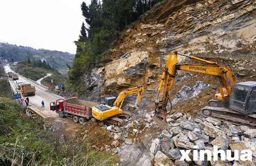 3月23日,大型機(jī)械進(jìn)入山體垮塌現(xiàn)場(chǎng)進(jìn)行搶通作業(yè)。