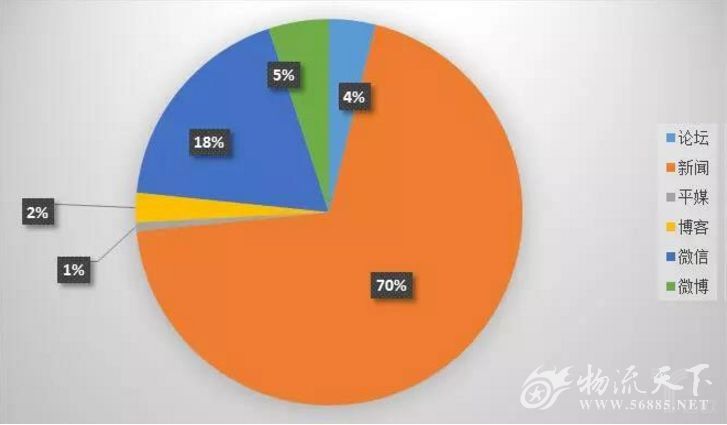 物流地產關注度占比中新聞類傳播占比最高,占總傳播量的70%,其次是微信,占比18%。微博、論壇、博客、平媒則分別占總傳播量的5%,4%,2%,1%。