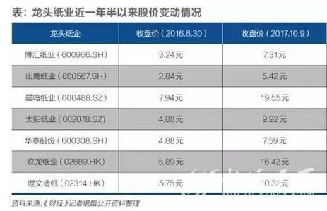 《財經》根據二級市場股價,計算出了多家龍頭紙企近一年半以來的股價變動情況。統計如下: