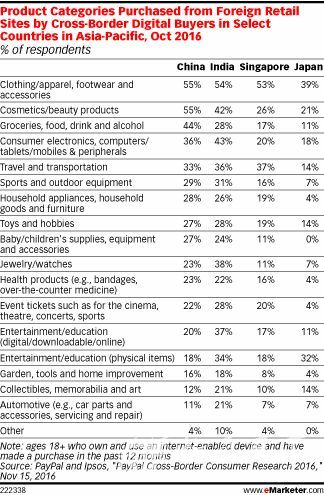 印度網絡零售發(fā)展滯后于亞太地區(qū)其他國家,網購消費者普及率也較低。在印度,互聯(lián)網就意味著手機,這也是消費者參與跨境電子商務的主要方式。服裝、鞋和配飾是最受印度消費者歡迎的,54%的消費者購買過這些商品。其次是電子產品(43%)、化妝品和美容產品(42%)。eMarketer預計,2016年日本網購消費者普及率排在全球第二位,82.5%的日本網民經常網購。但是,日本消費者更傾向于境內;境外購物的消費者僅占4%。