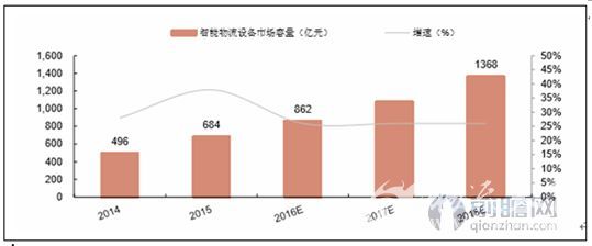 根據(jù)前瞻產(chǎn)業(yè)研究院發(fā)布的《中國(guó)智能物流行業(yè)市場(chǎng)需求預(yù)測(cè)和投資分析報(bào)告》數(shù)據(jù)顯示,2015年我國(guó)智能物流設(shè)備市場(chǎng)容量達(dá)到684億元,2016年為862億元,預(yù)計(jì)2018年將達(dá)到1360億元,年增速在20%以上。