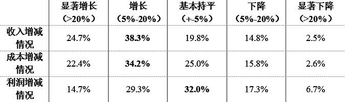 企業利潤增長幅度慢于收入和成本,32%的企業利潤增長基本持平,29.3%的企業利潤增長在5%-20%,14.7%的企業利潤增長超過20%,還有24%的企業利潤出現下降,6.7%的企業利潤下降超過20%。