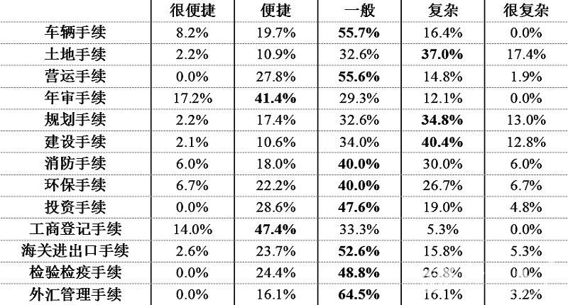 調查顯示,年審、工商登記手續較為便捷,土地、規劃、建設、消防、環保、檢驗檢疫等手續較為復雜,車輛、營運、投資、海關、外匯管理手續總體一般。