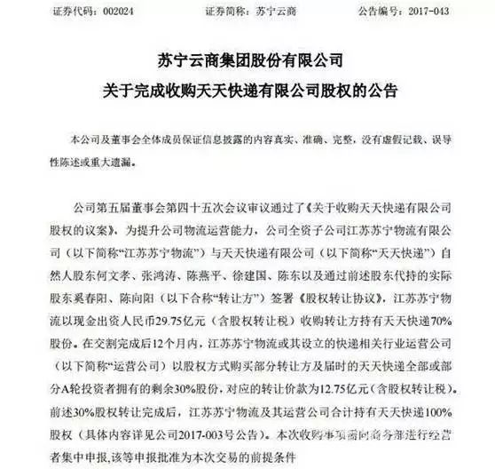 這意味著,自蘇寧1月3日發布收購公告后,歷時116天,股權交割已正式完成,這項收購計劃塵埃落定,已無任何懸念。接下來12個月內,蘇寧方面以股權方式購買剩余30%股份(轉讓價款為12.75億元)。完成后,蘇寧合計持有天天快遞100% 股權。