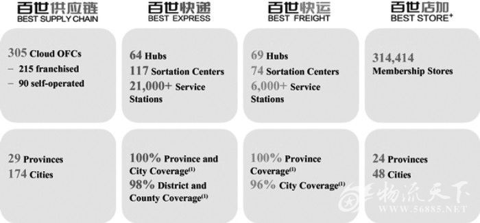 根據文件,目前百世快遞的大型中轉中心有64個、分揀中心117個、快遞服務網點超過21000個,100%覆蓋中國所有省市,覆蓋鄉鎮比例高達98%。