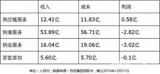 百世持續虧損。而百世的虧損情況也一直被外界關注,根據招股書上的公開數據,2014~2016年虧損從7.1億到10.5億,再到13億,一直保持著虧損的狀態,且逐年虧損擴大。