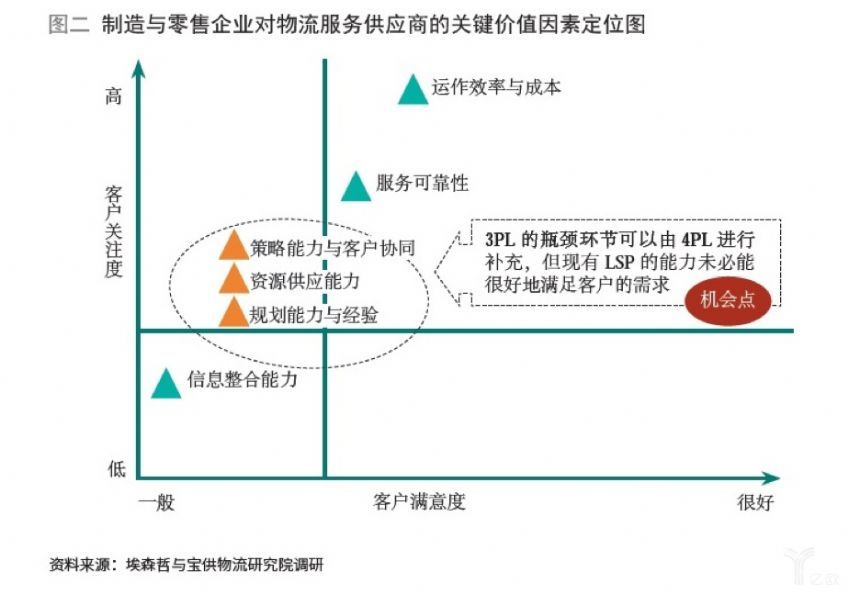 我們認(rèn)為,這種新需求是企業(yè)內(nèi)部成本控制的外在表現(xiàn),是剛性需求。由調(diào)研結(jié)果進(jìn)一步分析企業(yè)對物流服務(wù)供應(yīng)商(LSP)價(jià)值因素的關(guān)注度與滿意度二維矩陣(見圖二),在運(yùn)作效率和成本、服務(wù)可靠性與人員能力這些傳統(tǒng)業(yè)務(wù)需求上,第三方物流供應(yīng)商仍能扮演稱職的角色,但針對供應(yīng)鏈策略能力、客戶協(xié)同能力、資源供應(yīng)整合能力這三項(xiàng)新關(guān)注的需求,企業(yè)對LSP的滿意度相對偏低,凸顯了現(xiàn)今第三方物流業(yè)務(wù)瓶頸與能力的局限性,也代表第四方物流企業(yè)新的契機(jī)。